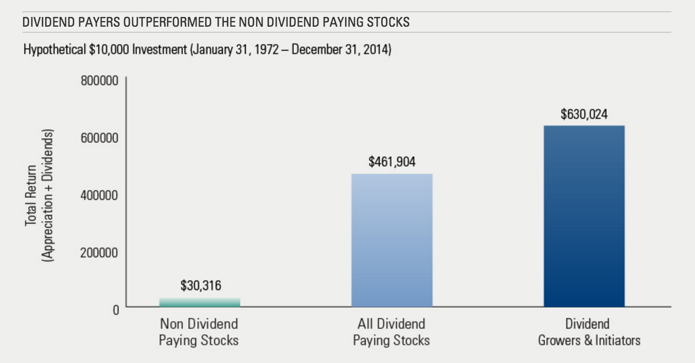 According to these findings, a $10,000 investment in non-dividend stocks on Jan. 31, 1972, would have turned into $30,316 at the end of 2014. The same amount of money invested in dividend-paying stocks would have an ending value of $461,904, while investing in companies starting new dividends or increasing their dividend payments would have resulted in a much bigger ending capital of $630,024.