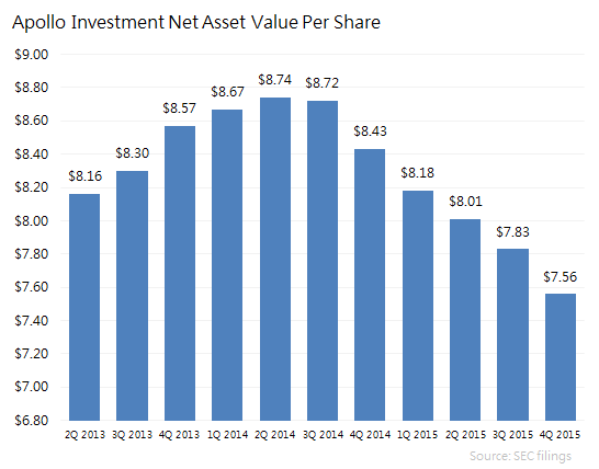 As its investments are affected by falling loan prices and weakening credit conditions in its energy portfolio, Apollo Investment's book value has now dropped six quarters in a row.