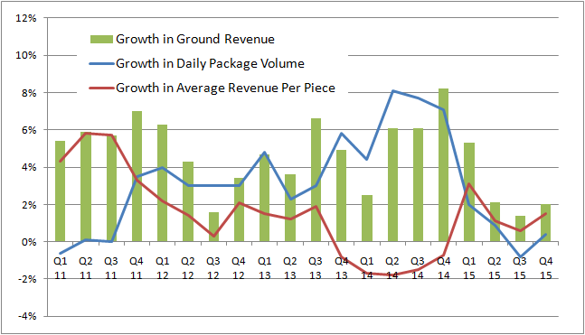 Indeed, air (next-day air and deferred) average daily package volume grew by double digits in the quarter, but ground (which made up 71% of U.S. domestic revenue and 45% of total company revenue in 2015) only grew 0.4%. You can see the ongoing dynamics in the ground business below.