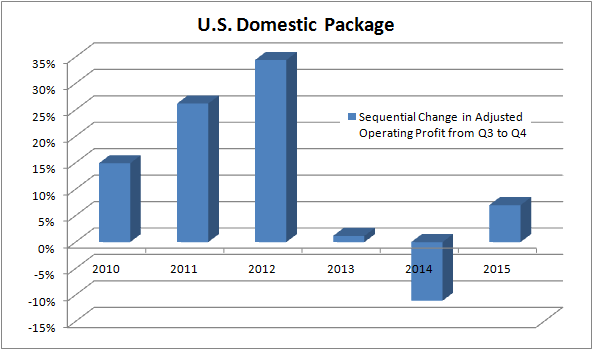 Investing conclusion: Surging e-commerce demand during peak brings challenges as well as opportunities and isn't a catchall argument for buying the stock. U.S. domestic adjusted operating profit in the fourth quarter of 2015 was just 2% higher than in the same period in 2011.