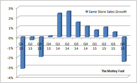 Consequently, sales growth has been hard to come by recently. Adjusted reported sales fell 2.6% in the fourth quarter, and same-store sales growth has turned negative.