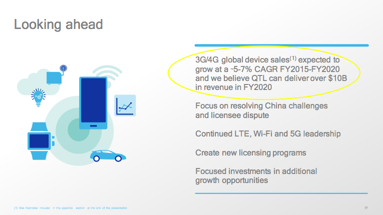 In the most recent example, Qualcomm saw QTL revenues decline 12% in its most recently reported quarter, even as overall reported relevant cellular device sales increased roughly 7% to $60 billion in its most recent quarter. But what about those dispersing headwinds in the years to come?