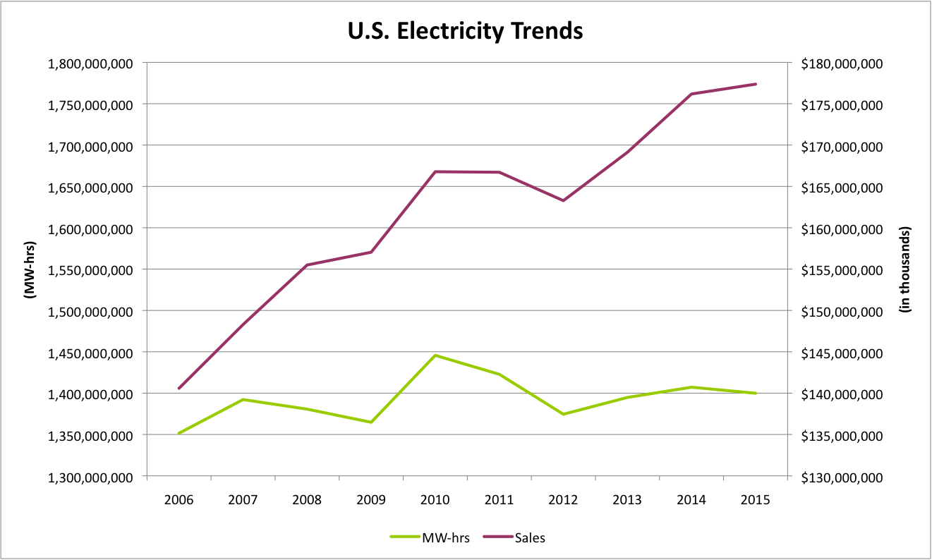 To put this data another way, total electricity sales rose 26.2% between 2006 and 2015, while electricity consumption rose just 3.6%. To be fair, that 2.6% compound growth rate in overall electricity costs is only slightly higher than the rate of inflation, so that growth rate isn't so shocking.