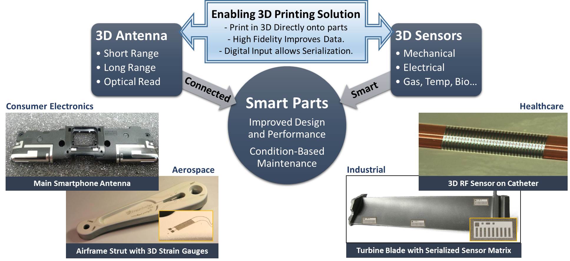 Optomec's Aerosol Jet 5X system enables sensors to be printed directly on high-value components, which will provide critical feedback about their structural health, allowing GE to determine exactly when parts need maintenance and repair. This "conditional-maintenance system" could substantially reduce the life-cycle cost of complex mechanical systems. GE has traditionally based its maintenance and repair schedules on the early end of expected-life ranges, which means many parts get replaced earlier than needed.