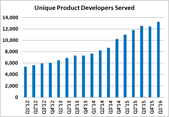 It may not have been a record sales quarter for Proto Labs, but the company did serve a record number of product developers, which suggests continued growing acceptance of its manufacturing services. In total, Proto Labs served 13,249 unique product developers in the first quarter, an increase of 20% annually and 6.7% sequentially.