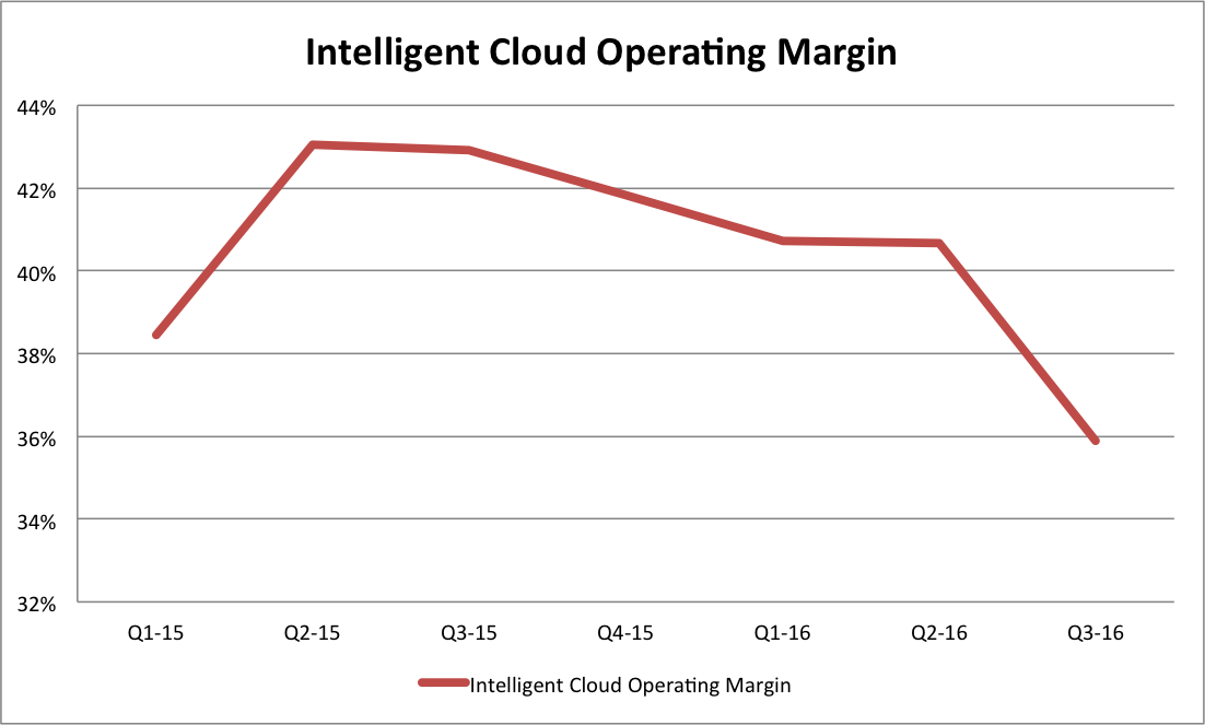Though far from cataclysmic, Microsoft's cloud business showed several signs of weakness in Q3, especially when considered in total. For starters, though growing faster than other reporting segments, Microsoft's intelligent cloud business produced its slowest growth thus far in its fiscal 2016.