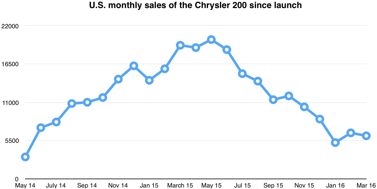Overall, it looked like a success. Sales of the new 200 quickly eclipsed those of its predecessor and were growing sharply. But then, last summer, FCA stopped promoting the sedan. Since then, sales of the 200 have fallen off a cliff.