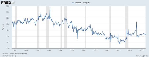 As you can see from the chart, increases in the personal saving rate only seems to occur when there's a recession and a motivation to save. Over the past 50 years, the personal saving rate has been more than halved to 5.5% as of Nov. 2016 from 11.7% in Nov. 1966. Comparatively, citizens in most developed countries sock away around 10% of their income, which falls right into the wheelhouse of what most financial advisors in the U.S. would suggest (saving 10% to 15% of your income).