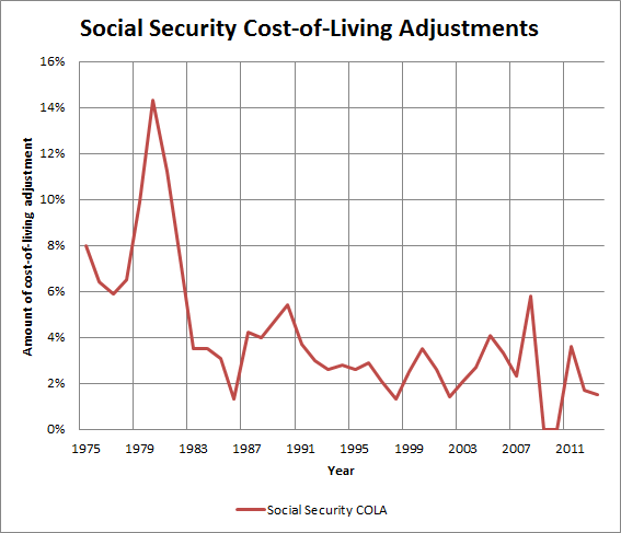 Source: Social Security Administration. Note: Year reflects the year for which inflation data was measured; benefits increased at the beginning of the following year.