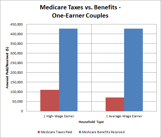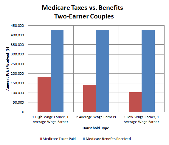 For couples, when both spouses earned the $44,800 average, they paid less in taxes, but got exactly the same benefits; their net gain was a larger $286,000. The hypothetical couple with an average earner and a low-income worker earning $20,200 paid just $102,000 in Medicare taxes to get exactly the same benefits, bringing the profit to $325,000.