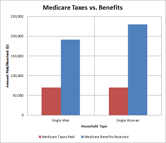 The results were uniformly shocking. For a single man reaching age 65 in 2015 who earned the 2013 average wage of $44,800, Medicare taxes would add up to $70,000 over the course of a lifetime. But the benefits of Medicare would add up to $191,000, producing a net "profit" of $121,000. A single woman earning that same wage fared even better, as her longer life expectancy produced anticipated lifetime Medicare benefits of $230,000, boosting the gain to $160,000.
