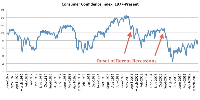 It may seem silly to give any credence to a study that simply measures the opinions of 5,000 households, but put in the appropriate light, it can serve as one of (hopefully) many data points. Over time, consumer confidence generally moves in correlation with the stock market and overall economy. When optimism pops over 100, stock prices and the economy in general tend to peak, and then fall to more historical levels.