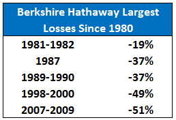 Roughly every 6-7 years, Buffett's investment vehicle suffered a rather large crash in its stock price. Yet since 1980 the stock compounded at a rate of 21% per year, good enough to double your money every three-and-a-half years.