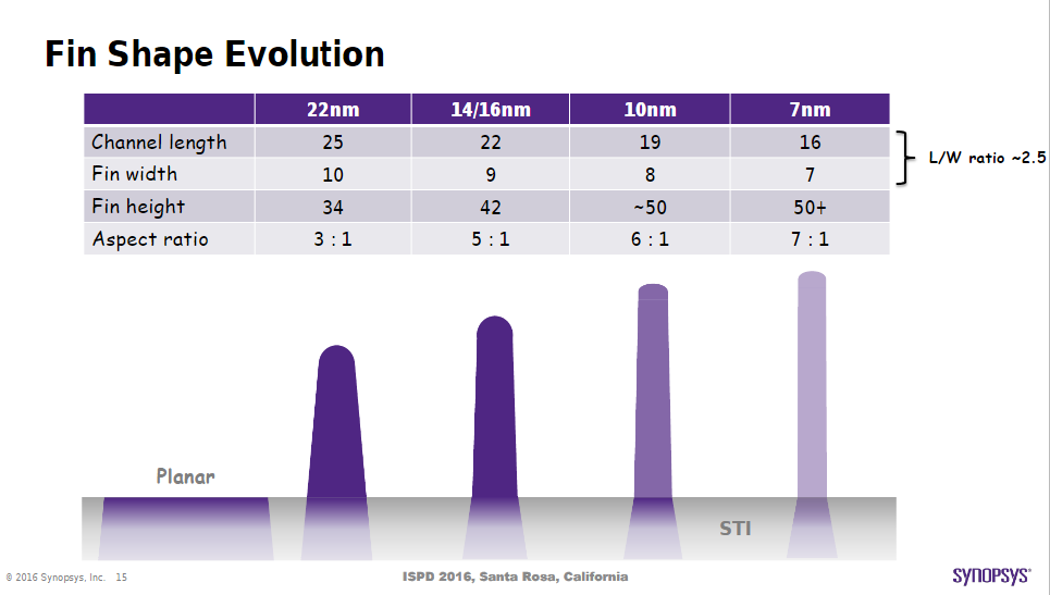 What's more interesting is that Synopsys says that at the 10-nanometer node, chip manufacturers will move to fin heights of approximately 50 nanometers and widths of 8 nanometers. And, at 7-nanometers, fin height goes above 50 nanometers.