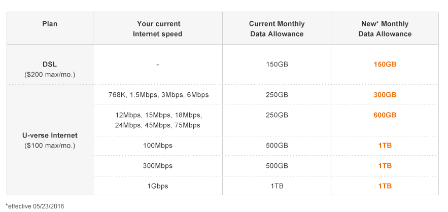 The company has decided to start enforcing data caps on customers who do not have an unlimited plan. This decision hits people stuck on its older DSL systems hardest, as they now face overage charges of $10 per 50 GB of up to $200 a month, while U-verse users pay the same $10 per 50 GB charge but have a $100 monthly penalty cap. In addition, the people on the lowest DSL tier, 150 GB, did not receive an increase in their data, whereas most other levels did.