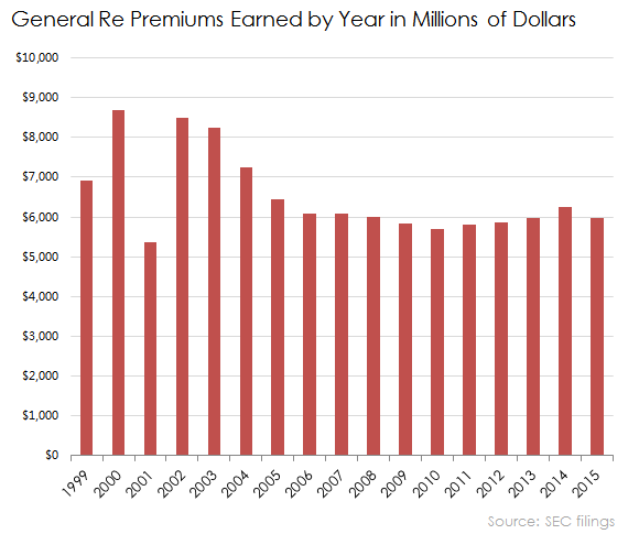 The truth is that it's never been easy for General Re. Ever since its 1998 acquisition, revenue has been trending lower, not higher. In an unfortunate twist, during years in which it earned the largest premiums, it also recorded the largest underwriting losses.