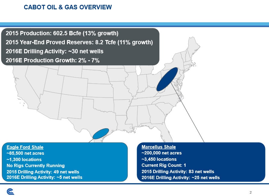 Not only do Cabot Oil & Gas and Vanguard Natural Resources offer investors two entirely different credit profiles, but their portfolios couldn't be more dissimilar. Cabot, as the slide below shows, is entirely focused on just two shale plays: