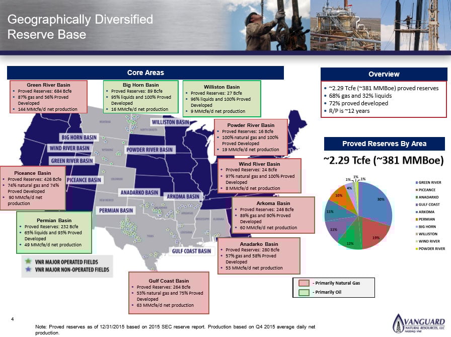 Vanguard Natural Resources, on the other hand, is much more diversified across a number of different production basins, as we can see from the map on the slide below: