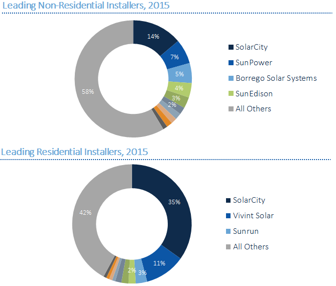 It may seem like commercial solar would be an easy market to enter in the U.S., but it's proven very difficult for some big solar companies. SolarCity (SCTY +0.00%) has struggled to hit its own growth targets and project timelines, and has only 14% of the market. That's followed by 7% for SunPower (SPWR +0.00%), but the top 10 installers still had just 42% market share in 2015.