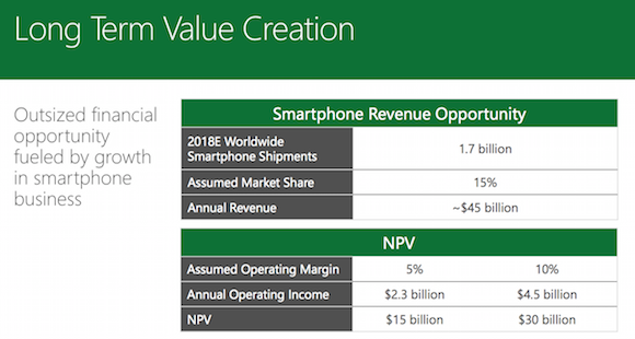 Microsoft also had high hopes for turning around the handset business' steep operating losses, which were necessary in order to reach a net present value (NPV) of $15 billion to $30 billion.