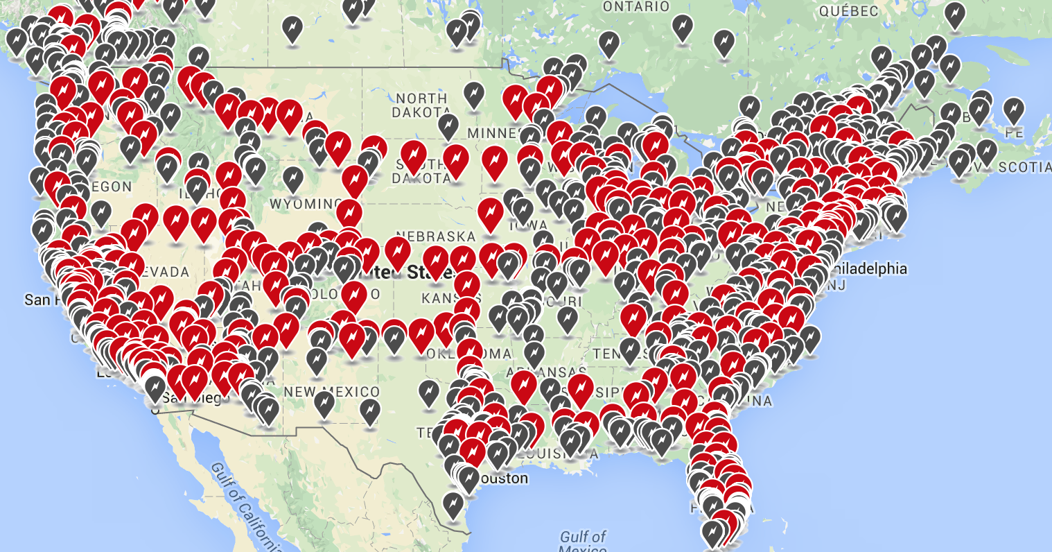 Tesla's charging network in the U.S. Red icons indicate Supercharger locations. Gray icons indicate Destination Charger locations. Image source: Tesla Motors.