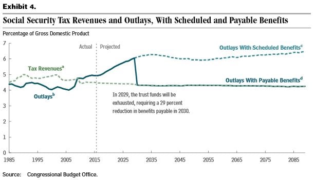 The Congressional Budget Office projects that Social Security outlays will exceed tax revenue by "almost 30% in 2025 and by more than 40% in 2040." Obviously, that's untenable.