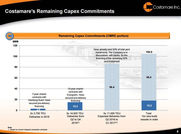 As such, it is now a step ahead of rivals like Costamare Inc. (NYSE: CMRE), which as the slide below shows, still needs a very large percentage of its capex commitment to be funded over the next couple of quarters: