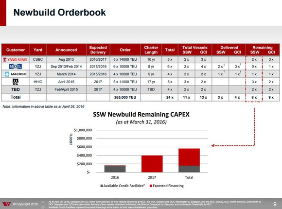 Add it up, and Seaspan raised $750 million in capital. After using $225 million of that cash to redeem higher-cost preferred shares, it was left with $525 million to fund newbuild commitments. That's almost enough to fund the company's entire remaining newbuild capital expenditures through the end of next year, as noted on the slide below: