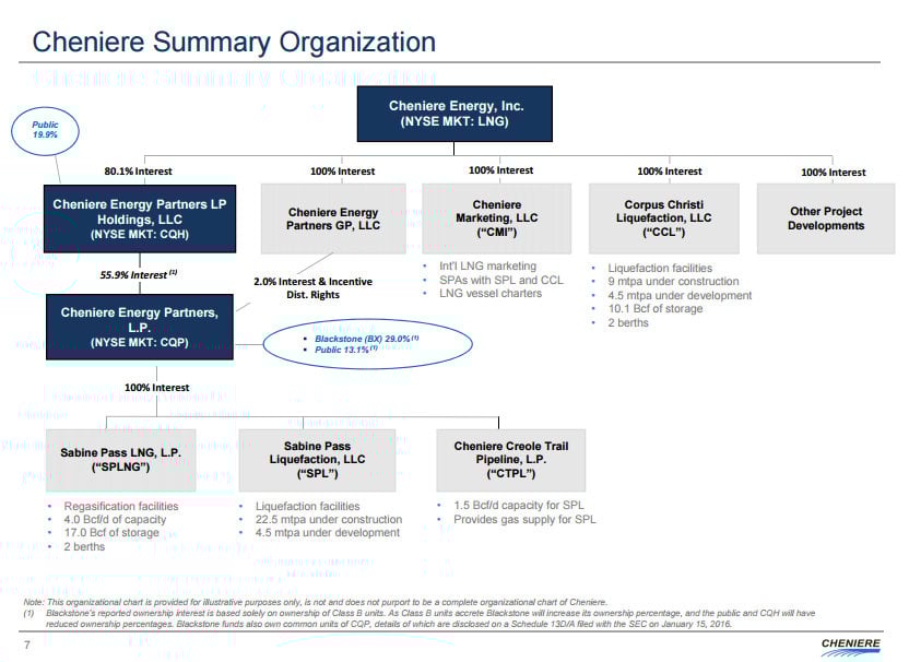 The Cheniere organization is made up of three publicly traded entities: the aforementioned Cheniere Energy and Cheniere Energy Partners, as well as Cheniere Energy Partners LP Holdings (NYSEMKT: CQH). Of the three, Cheniere Energy stands atop the organizational structure, which is shown on the slide below: