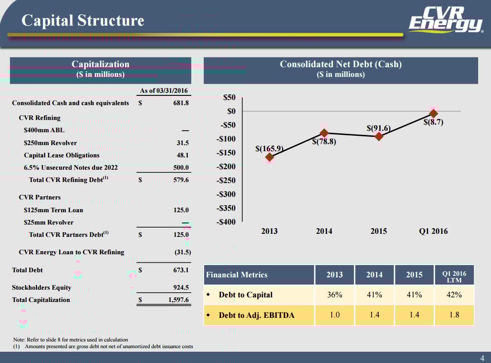 That's a lot of cash, and in fact it was more than the combined debt of both CVR Refining and CVR Partners as of the end of last quarter. In other words, this is a cash-rich parent company that could also come to CVR Partners' rescue if it needed some assistance. In fact, it has already provided assistance to sibling CVR Refining, via a $250 million revolver, which had $31.5 million outstanding as of the end of last quarter.