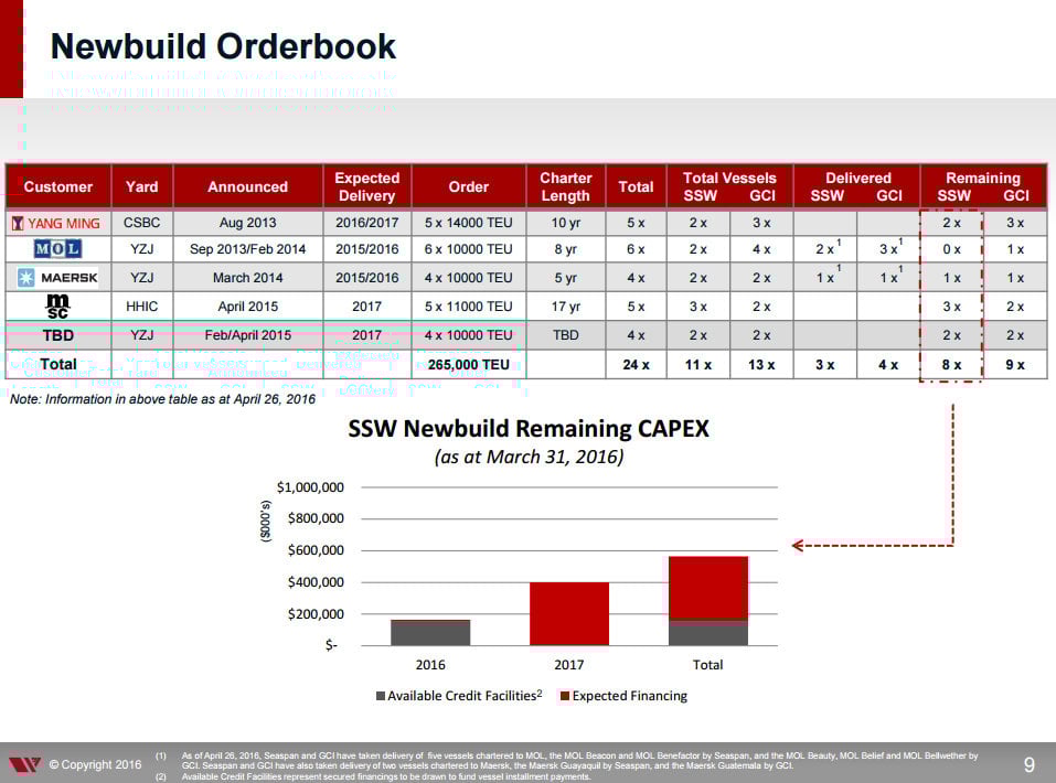 All that being said, the vessels not under contract constitute a risk that needs to be monitored. As that above slide noted, two of Seaspan's eight remaining newbuilds are not signed to customer contracts. Meanwhile, its joint venture with the Carlyle Group (CG +0.00%), GCI, also has two unsigned newbuilds scheduled for delivery next year. In other words, these vessels were built on speculation and not at customer request. As such, Seaspan and the Carlyle Group are on the hook for paying for these vessels when they're delivered next year, but might not be earning income from them right away. Under a worst-case scenario these ships will be docked, which would cost Seaspan more money.