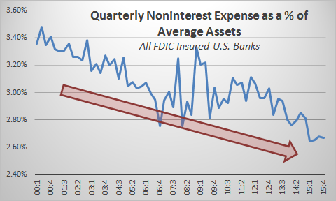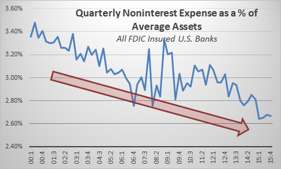 How is that possible? Credit goes to bank management teams doing an excellent job cutting costs and streamlining their operations. The chart below shows the average ratio of noninterest expenses to quarterly average assets for all U.S. banks. The trend is clear: Banks are in fact reducing their operating expenses, and they're doing so in the face of rising regulatory costs.