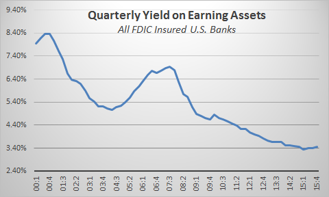 According to data from the FDIC, the average yield on earning assets across the banking industry was 3.48% in the 2015 fourth quarter, 49% lower than at the pre-crisis peak in the second quarter of 2007. It's down even farther from the high rates seen around the turn of the century.