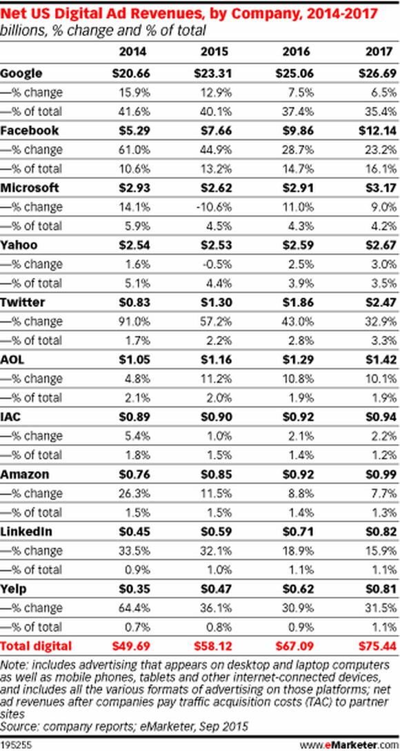 These latter estimates are also more in line with what we've seen in previous research. For example, eMarketer gauged the two companies' combined digital ad market share in the U.S. last year at just about 53%. More importantly, the firm did not see that growing substantially in coming years.