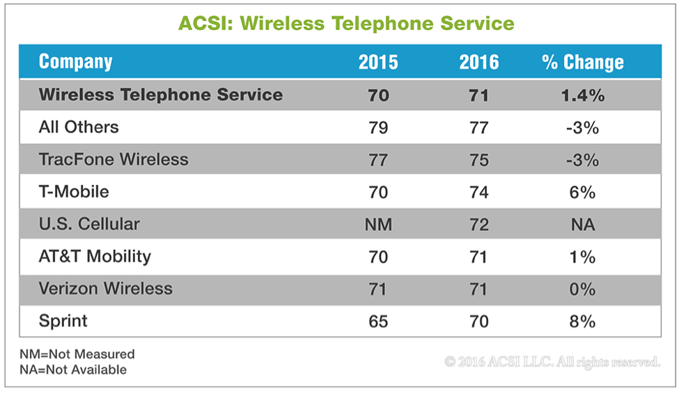 While the numbers are not overwhelming, T-Mobile did post the highest ACSI score of all the major carriers. Legere's company jumped from a 70 in 2015 to a 74 this year on the 100-point scale. That's a 6% jump that had the carrier topping AT&T and Verizon, which both scored 71, and Sprint (S +0.00%), which brought up the rear at 70.