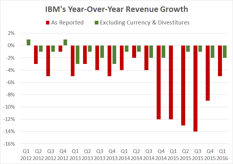That's essentially what happened in 2015, when the U.S. dollar strengthened against many foreign currencies. IBM's reported revenue slumped 12% last year, but adjusted for both currency and divestitures of under-performing businesses, revenue fell by just 1%. This large discrepancy has been a trend for quite some time.
