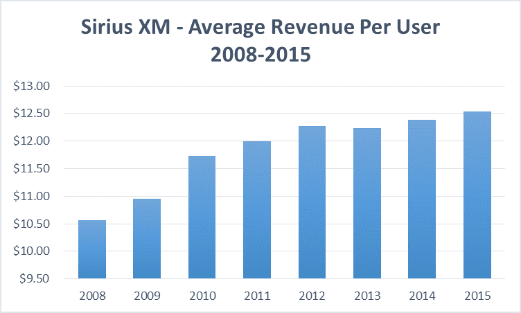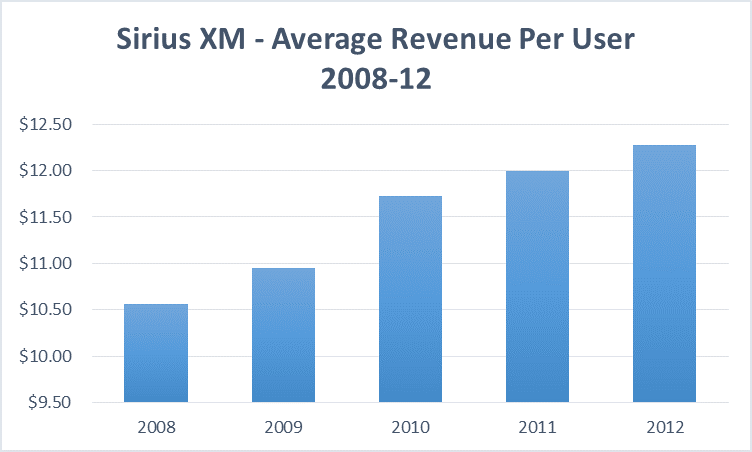 ARPU had been a key metric in evaluating Sirius XM's progress in the audio market for some time, and the company had been focused on consistently growing the number, which it did. ARPU was up an average 4% per year between 2008 and 2012.