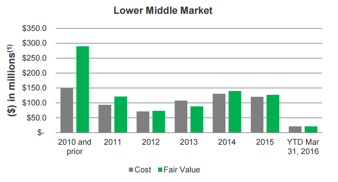 Besides dividend income, these investments have also generated the lion's share of its unrealized gains. Note that its lower middle-market investments originated in 2011 and prior are marked substantially above cost: