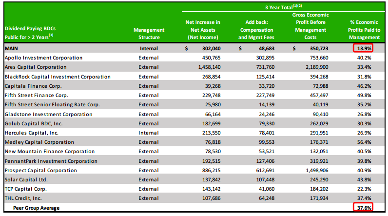 In an industry where so many companies spend a substantial share of their income paying management teams, Main Street Capital stands out in marked contrast. A focus on minimizing expenses -- mostly compensation -- has resulted in a substantially lower cost structure than the average business development company: