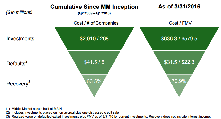 Starting in 2013, Main Street Capital began making loans to larger middle-market companies. Its presentation details the credit performance of this particular loan book, pointing out that its loss on default has been relatively low -- certainly much lower than it would expect to lose if a lower middle-market company defaulted on its debt.
