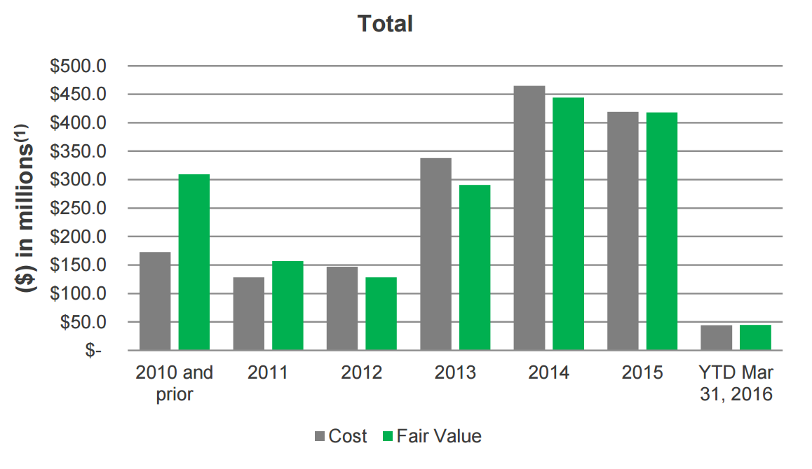 The success of its lower middle-market portfolio shows through in a similar chart that encompasses its entire portfolio. Investments that were originated in 2011 or prior underlie the majority of its accumulated unrealized gains.