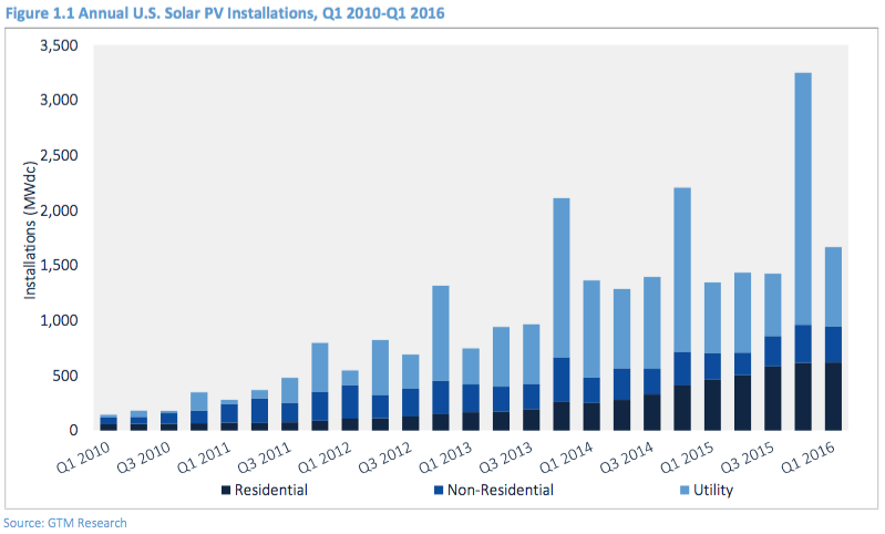 The latest U.S. Solar Market Insight report from GTM Research and the Solar Energy Industries Association is out and the U.S. market continues to roll. In the first quarter of 2016, 1.67 GW of solar was installed, up 24% from a year ago, and for the full year 14.5 GW of solar, enough to power 2.4 million homes. Based on the latest projections, 2.8% of U.S. operational electric-generating capacity could come from the sun.