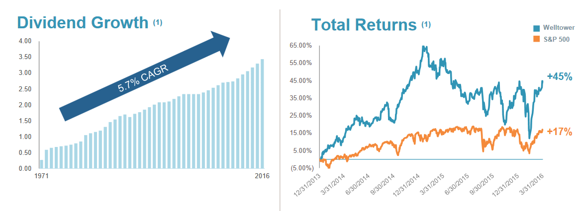 Welltower has a 45-year history of dividend growth. Although it hasn't increased its payout every single year, it has done a great job of growing shareholders' income by an average rate of 5.7% per year. Even more impressively, Welltower has produced an average total return of 15.6% since its inception -- a remarkable level of performance to sustain for more than four decades.