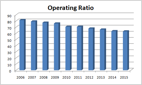 Union Pacific highlights its operating ratio as a key marker of productivity. It's just a simple way of defining operating expenses divided by revenue -- a useful measure for cost intensive industries like railroads. Knight reiterated expectations to reach around 60% by 2019, and a longer term hope to hit 55%. As you can see below, it's an area where Union Pacific has performed well in the last decade.