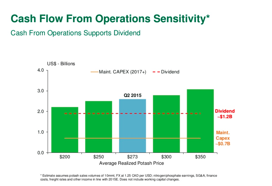 That low pricing environment also has implications for PotashCorp's dividend, which it pays out $1.2 billion annually. As the potash miner has itself noted, at $200 per tonne, the dividend is barely sustainable. It will likely strive to maintain it for sometime, but if pricing continues to cascade lower, there may be pressure to cut the dividend.