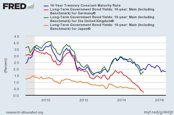 Today, it was the turn of the benchmark 10-year German government bond, which joins approximately $10 trillion worth of bonds worldwide that are now trading at negative yields. The following graph makes clear that the phenomenon of collapsing bond yields has afflicted developed markets worldwide during the post-crisis era, even if it is particularly pronounced in Germany (red line, with the U.S. 10-year Treasury yield in blue):