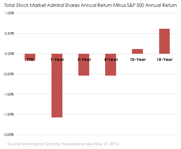 The Total Stock Market Index Fund's performance doesn't deviate much from true large-cap indexes like the S&P 500, because of the fund's portfolio weighting. As the chart below shows, the Total Stock Market fund has beaten the S&P 500 over 10- and 15-year periods, but failed to match it over shorter time periods.