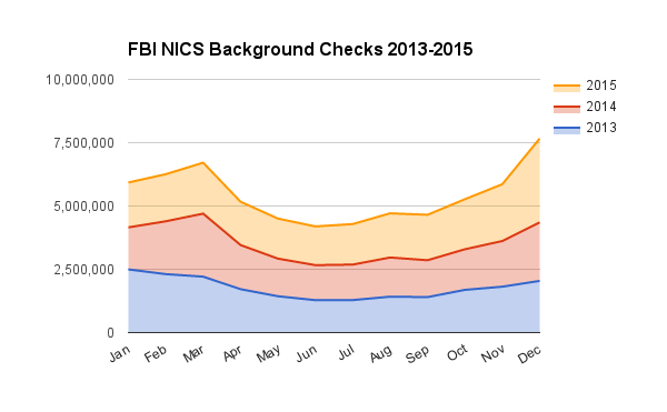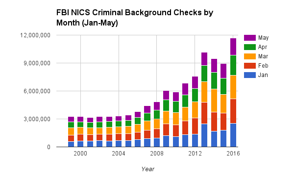 Last year, the FBI conducted more than 23.1 million background checks on people wanting to buy a gun, a huge record that many thought would be tough to break, but so far through May, the FBI is running 30% ahead of 2015. Last year at this point it had conducted 8.9 million investigations; this year, it's performed 11.7 million.