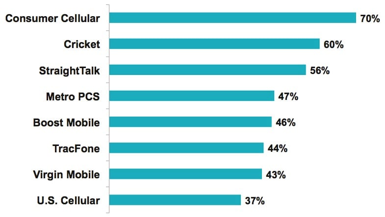 Perhaps most interestingly the research found that satisfaction levels are actually higher among people using non-contract carriers. In that category Consumer Cellular came in first followed by Cricket, StraightTalk, Metro PCS, Boost Mobile, TracFone, Virgin Mobile and U.S. Cellular (USM +0.66%).
