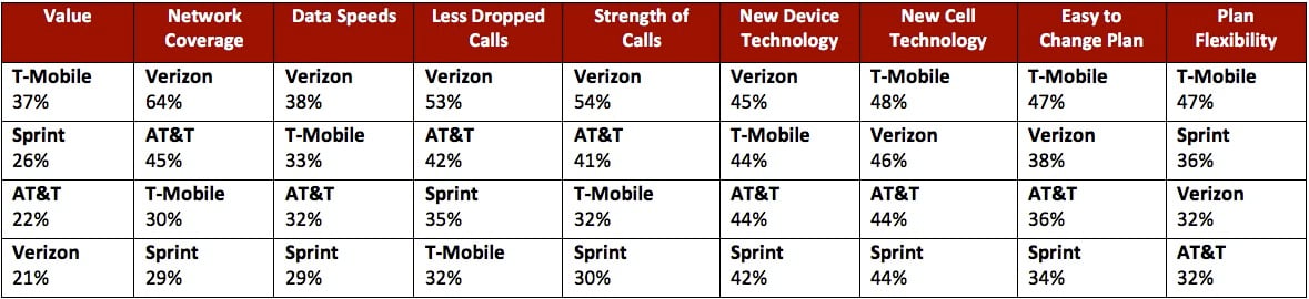 Verizon easily led the network coverage category and Sprint came in at or near the bottom for every category.